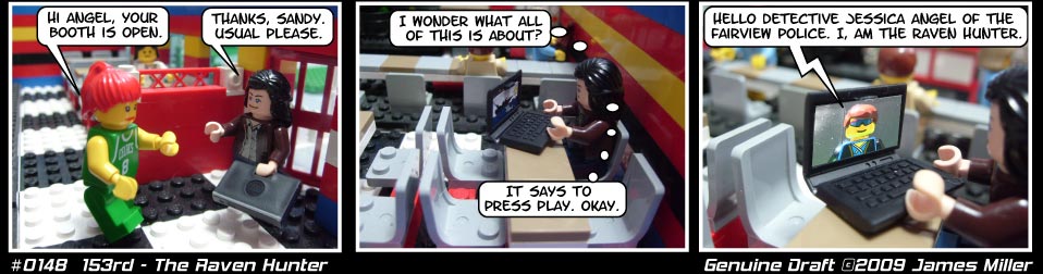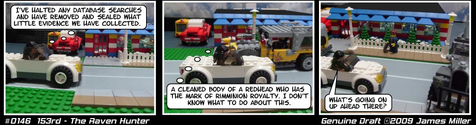 The Raven Hunter. Jessica is becoming paranoid, and for good reason. The red and yellow cars are from the Hot Rod Garage Factory set which I got on sale after Thanksgiving 2008 on LEGO.COM. Cool cars, just a bit large.