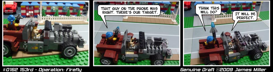 Rifts gone wild! What happens when there's a rift and rocket? Who knows. The third panel rocket is actually there. No Photoshopping to get it there. It's attatched to a clear piece that's being help up by a tree. It was a simple solution that's only noticeable at the original size of the strip.