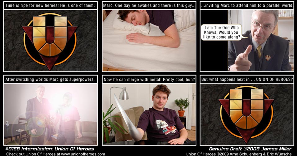 | Genuine Draft: Year 1 Page No.13 ![]() Strip # 168 Updated On 3/30/09 Todays intermission comic strip trailer is from Union of Heroes. It's a photo comic from Germany about superheroes. It's one of the comics on my link page so I like it alot. Check them out.