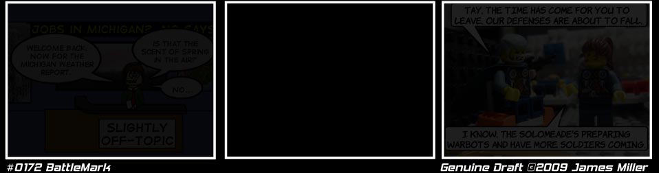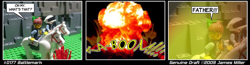 ![]() Strip # 170 Updated On 4/1/09 ![]() And to contiune the intermission, we have The Sons by Daniel Escobedo at www.thesonscomic.com. Thanks Daniel for the wonderful comic you provided. ![]() Strip # 171 Updated On 4/2/09 ![]() Genuine Draft's next intermission strip is Slightly Off Topic by David Adams. I've just started reading it and it's a bit odd, in a good way. Thanks Dave. ![]() Strip # 172 Updated On 4/3/09 BattleMark. It's a title that has been around since the late 80's. In this incarnation, it's was one of Friction Fit Theatre's original concepts. It was the main feature. I made nearly 60 strips of BattleMark before I lost interest in the concept. I had them lying around and decided to use them. BattleMark Act:1 No.173 to No.220 ![]() Strip # 173 Updated On 4/4/09 Battle Mark. I know there's a heavy Star Wars influence here. But! It was neccesary to tell the story and besides this was made before I got a bunch of new minifigs. ![]() Strip # 174 Updated On 4/5/09 In the world, Rimminion has the most powerful military technology. Solomeade, is the most agressive. Mylar, well, they were more passive thinking their neighbors would save them. The other races are long since gone or occupied by Solomeade. ![]() Strip # 175 Updated On 4/6/09 The set for these pics are 4 baseplates long. I built a few demo'd buildings then the various bases and defenses. Then just piled tons of bricks to make it look like a battle scene. ![]() Strip # 176 Updated On 4/7/09 This strip was extesivly photoshopped. It wasn't easy to get it to look like flight. So I scanned in the clouds, took a picture of the bomb and fighter on a black background. Erased the black, put the fighter over the clouds, added the jet fire a bit of motion blur and there you have Lego in flight. The bomb was done seperately, lotsa blur and it's dropped. ![]() Strip # 177 Updated On 4/8/09 The first 7 strips of Battle Mark were organized very poorly. I had a script and took pics as needed, it took a bit of work to get things lined up. So in some cases I just had to improvise. In case I failed to mention it, Battle Mark was the first version of my Lego comic which was later discontinued. More on that tomorrow. ![]() Strip # 178 Updated On 4/9/09 Another heavy photoshopped pic. The original BattleMark lasted 45 strips I think, they've been renumbered for this storyline. When I first filmed Genuine Draft, I had taken what I learned from doing these to make a better strip. There is more organization, each panel gets it's picture number written next to it so I don't have the problems like I did with the Battle Mark strips. ![]() Strip # 179 Updated On 4/10/09 Rose has returned. A simple effect for the view screen. The 3rd panel full of burps, the technicle term for Big Ugly Rock Pieces. Not many fans in the building communities but they have a simple purpose. ![]() Strip # 180 Updated On 4/11/09 Between Mylar and Rimminion is a De-Militarized Zone, a DMZ. They don't have any issues with each other, but Mylar is kinda pushy with their Global Government push. Of course since they've been over run by Solomeade, it's a potential conflict area between Rimminion and Solomeade. ![]() Strip # 181 Updated On 4/12/09 I like the way the 1st panel turned out. But getting the weapon effects were not something I am happy with. I have new ways of doing them now that look good. Panel three is once again using a pic that wasn't numbered or in reality what I wanted. When I assembled them into panels, I didn't have the picture I need so I improvised. And used one of my favorite stock explosions. |