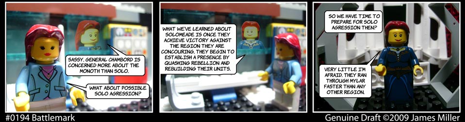 Now the first time this set was used, was at the first part of the Battle Mark storyline, it was on a green baseplate and had a slightly different interior. I had purchased some 6 x 16 black plates which are used above the white walls. When I moved it to the large grey baseplate, I rebuilt it where the red door can be removed and other wall pieces could be used on the back side. It's also part of the universal set. In Strip 100, the construction workers are actually in this set. The holotable has been used as Bob, Joe, and Tommy's coffee table. Nice thing aboot Lego is their versatillity.