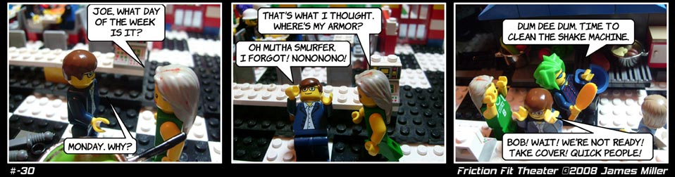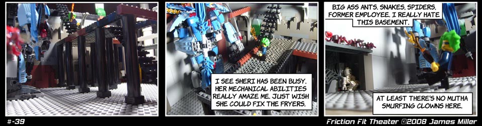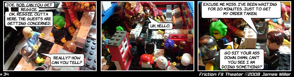 I found it to be kinda hard to shoot this second panel. Reggie is big enough that trying to get him to fit in the frame and not show the exterior where the roof would be wasn’t easy. Still a bit of SNOT showing on the right side. But it’s all blue. And, most servers really think what Sandy is saying.