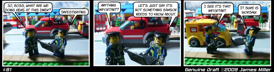 Look roads! I modified the front of Burgatory to accomedate the road. It used to be the parking lot. You can also see some of my Lego Pick a brick purchases, the tiles Jonny and Worsaw are standing on, the street lights. And if you look at the first panel, on the far left is an ambulance. Not a good sign. By now I’ve gotten used to using Illustrator instead of Photoshop for the words and balloons. Much better.
