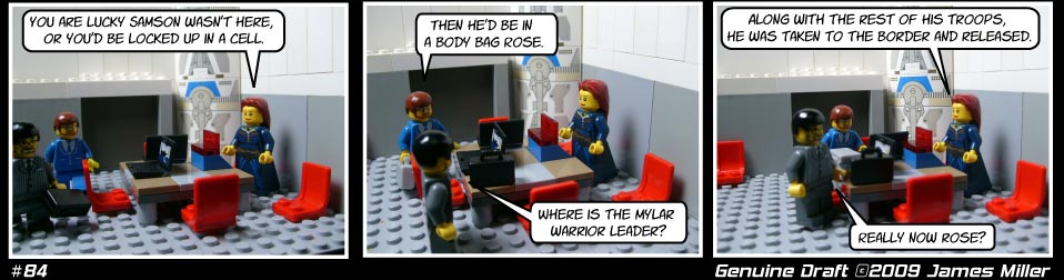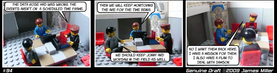Grudgel’s in charge and Rose is gone. What happened to her? Stay tuned. Hmmm, Samson better becareful, and what’s this mission about? I don’t know. I haven’t typed the words for the next few strips as I write this!