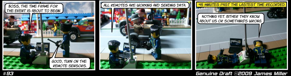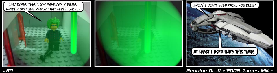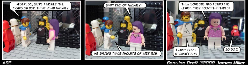 Classic space guys and a hot fleshie chic. That’s Tyler of the Pudarie. She was the face on the video screen who was giving all the info on the crystal the 153rd has. The hair is digitally colored purple. And she does have a different face. I wasn’t able to find it when making this strip. This series of strips has a nod to some of my favorite Lego comics, if you can identify them leave a comment. And of course, there’s a joke about Bob’s intelligence.