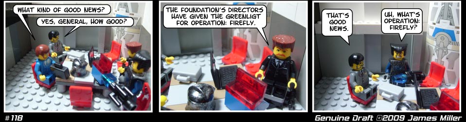 F-1, and F-2, the guys in suits. Generic Foundation guys who report back and forth to someone higer. Jonny is getting ready for a mission that was mentioned way back in strip #94 and #95.
