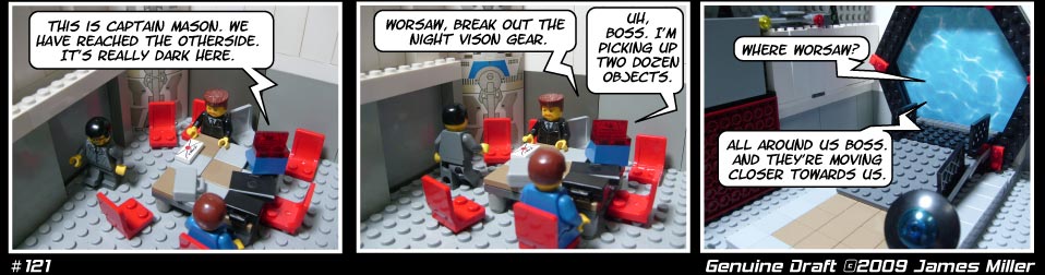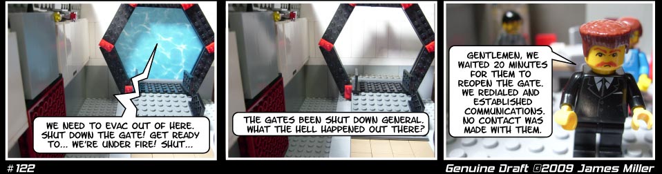 The Stargate. Not the most detailed but I like it. There’s also a white one for “Off world” that is built. The puddle is made from scrapbooking paper that is water looking. It looks better than digital, the reflection on the left side wall is a benefit of practicle effects. I love the 3rd panel he just looks disappointed at the outcome.