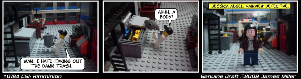 Here we go, CSI:Rimminion. Okay I know they are in the city of Fairview, but Rimminion just works better. Jessica Angel, it isn’t the name I was going to use originally, I combined 2 characters I have that are named Jessie and Angela from a line of stories I have that interact with all of the stories I have plotted out that I am basing this comic on. She’s made up of Indiana Jones set minifigs.